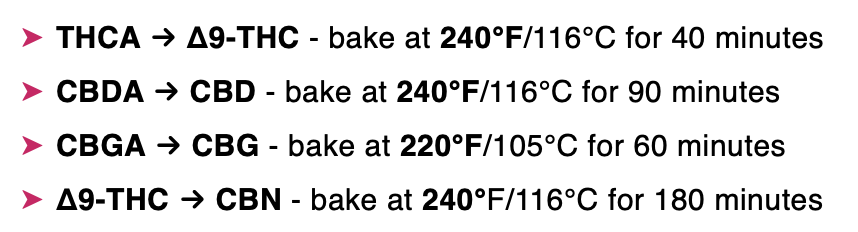- THCA → Δ9-THC – bake at 240°F/116°C for 40 minutes